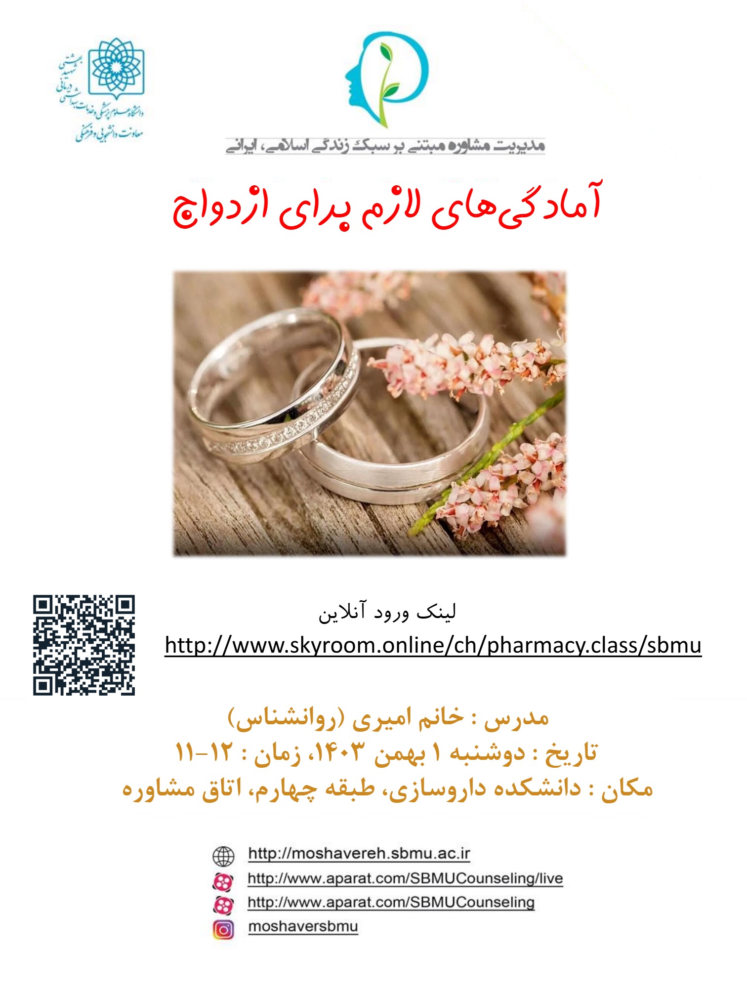 کارگاه مجازی آمادگی های لازم برای ازدواج توسط سرکار خانم امیری ( روانشناس) در روز دوشنبه 1 بهمن  1403 ساعت 11 الی 12 در بستر اسکای روم دانشکده داروسازی برگزار شد.