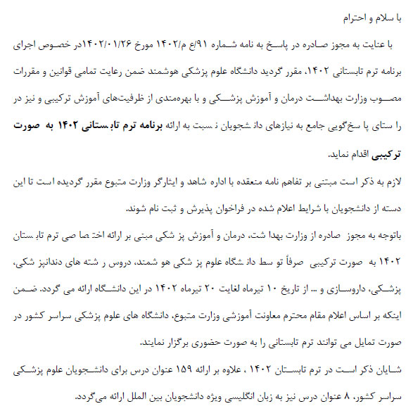 ارائه ترم تابستان 1402 به صورت مجازی توسط دانشگاه علوم پزشکی هوشمند